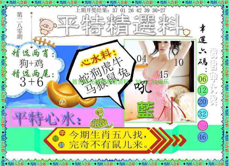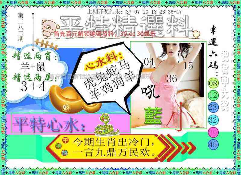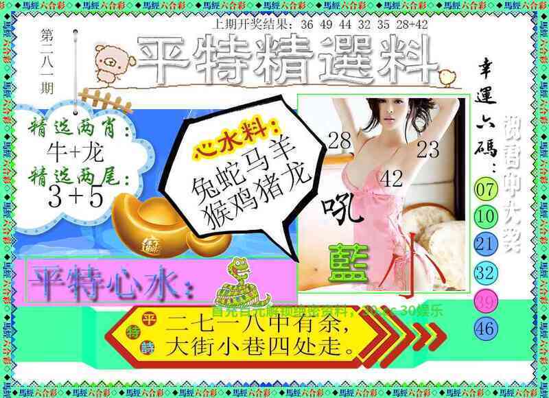 281期【解一句真言】:华夏大地羊马来,大地,解地肖蛇羊虎鼠狗鸡 王牌看好生肖:蛇羊虎鼠狗鸡 王牌看好波色:蓝波+绿波 王牌看好单双:单数+马虎 |